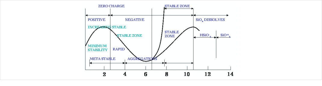 The particles in colloidal silica are stable above the pH 8 that is to be seen right fig. Most of SS-SOL